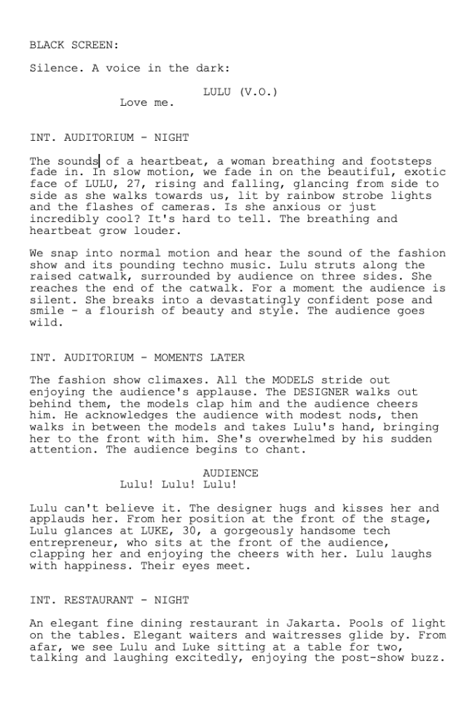 The first page of my first full movie script, a romantic comedy. Lulu is an unlucky-in-love model who tries an outrageously unconventional (and hilarious) approach to win back Luke, the man of her dreams.